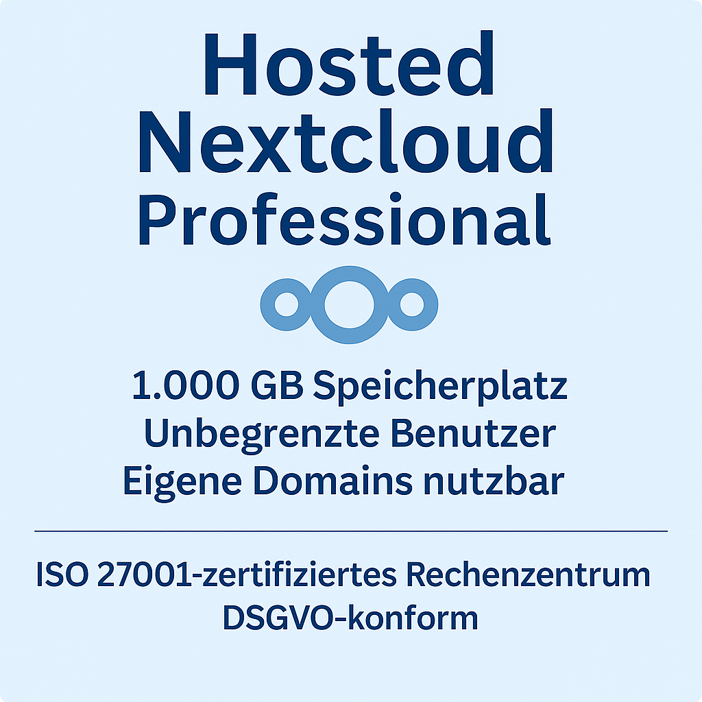 Für Unternehmen, die Nextcloud als zentrale Plattform für Zusammenarbeit, Dateiablage, Kommunikation und Prozessdigitalisierung nutzen wollen, bietet die Professional‑Variante den optimalen Funktionsumfang – sicher, flexibel und professionell betrieben.